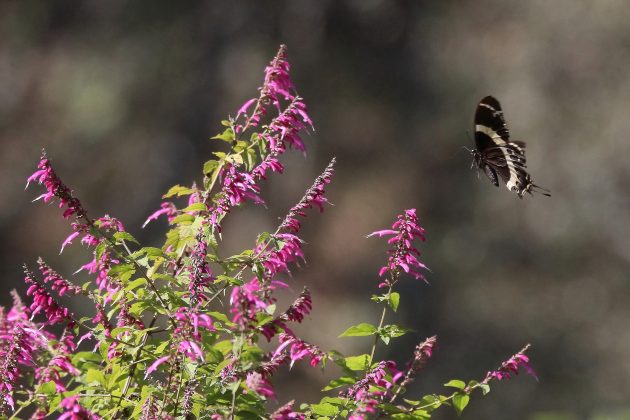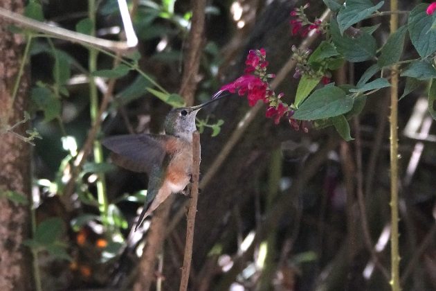 The middle section of this long walk must have some great groundwater, because its Salvia patches are still in wild bloom long after most such patches have gone to seed. It had been more than two months since our summer rains ended. But don’t tell these Salvias. And since those are the favorite nectar sources for our hummingbirds, the action was fast and furious. We counted 29 individuals from 5 species there. (The reservoir area had gifted us 7 more individuals from 3 species, all different from the 5 forest species.)