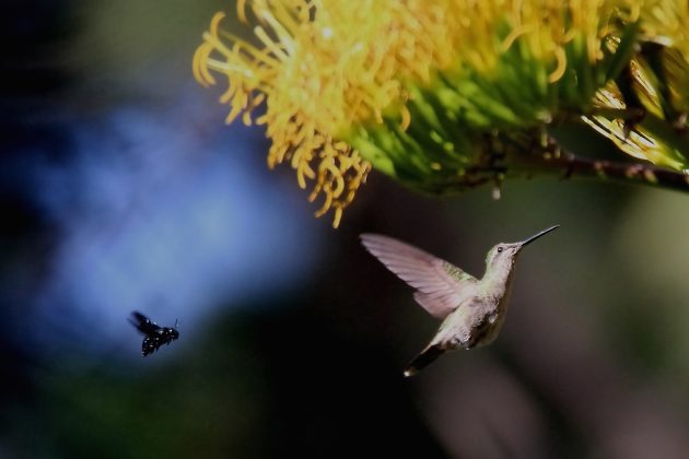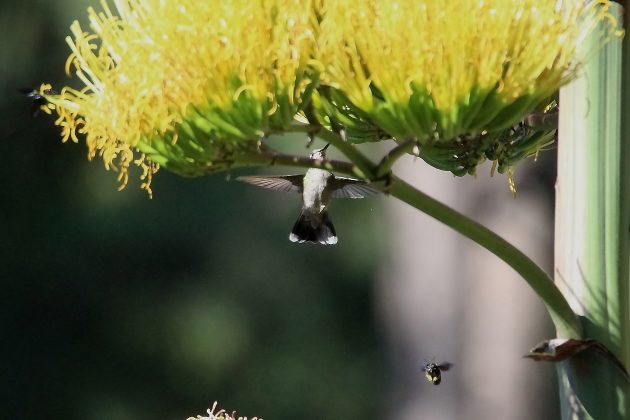 A few hundred meters higher up, we came upon an agave in full bloom. You’ll note from my photos that the insect activity was intense. But we also knew these massive plants can draw interesting birds. The one hummingbird that showed up kindly showed its bold white tail corners, revealing that this was a female Blue-throated Mountain-Gem, one of our less common hummers.