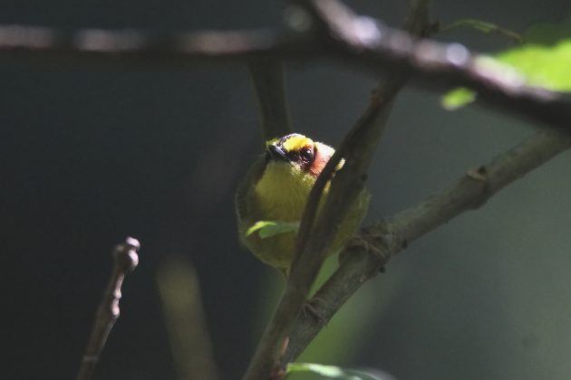 But then we got to the first section of mature oak trees. And suddenly, birds were everywhere. We found ourselves surrounded by a wonderful mixed flock. There were Wood Warblers from perhaps a half-dozen species, three kinds of Vireos, plus Kinglets, Gnatcatchers, and Flycatchers. Better yet, all five of our regular Tanagers were there. Bright red Summer Tanagers, brick-red Hepatic Tanagers, yellow Western Tanagers with black wings and orange faces, the Flame-colored Tanager which replaces the Western’s yellow with bright orange, and the charming smaller Red-headed Tanager with its olive body and orange-red head. With so many birds, we commentedd that we needed more eyes to see them all. I told Nacho that I wished Jonathan would arrive… just before we saw him climbing the path.