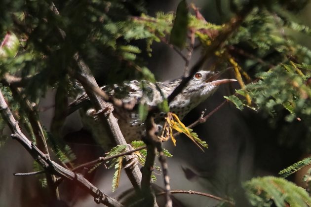 Nacho and I arrived first, as Jonathan had to do a family errand on his way out. We had decided to go to El Temascal, a small tourist settlement with a path that climbs diagonally some 200 m (660 ft) up a steep ridge, with a sudden change in species at the path’s highest section. Usually, the activity begins as soon as one begins hiking the path. We passed a section of thick brush where a Colima Warbler can often be seen in winter, and… nothing. A nearby section hosted a fantastic Slaty Vireo last summer. But now, there wasn’t any birdsong at all to be heard. I was getting nervous, as it had been my idea to go to El Temascal this outing.