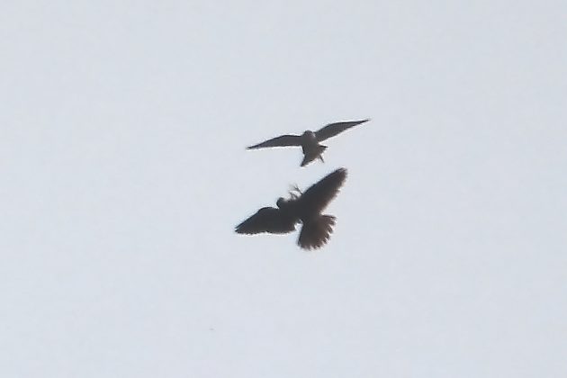 On our way downhill, the greatest spectacle was a pair of Peregrine Falcons wheeling overhead, who then took to what appeared to be play-fighting. Photographing the show proved beyond my capabilities, but they did just barely show what was happening above us.