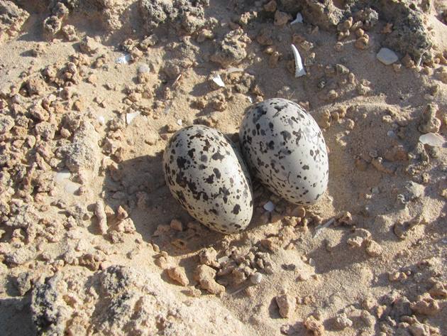 As you can see from the two nest sites the eggs do vary slightly in colour and patterning and are all individually identifiable. The first egg laid is not necessarily the first egg hatched, but they do hatch within about 24 hours of each other. A recent threat to the area where all of these Pied Oystercatchers nest is the sudden interest in using “fat bikes” in the dune system. Many a cyclist must wonder why they are being chased off by a large bird as they ride up and down the dunes and hopefully they will consider the nesting birds and keep to the expanse of sand below the high tide mark in the future.