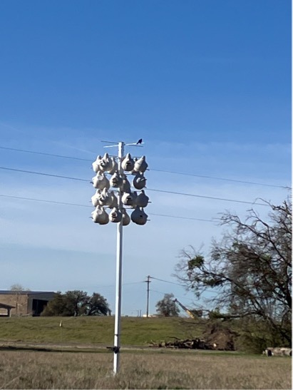The idea for a colony came to me while birding, as most good ideas do. I saw several Martins diving and swooping over a field between the San Gabriel River and the local waste management site. A perfect place for a rack of gourds; plenty of water and plenty of insects for food. I had to get permission from the city to erect the colony, then enlisted help and financial assistance from the local Audubon group. Some mountain bikers I’d met while birding helped build a trail to the rack and dug the hole for the post. It was a real group effort. We went big with a 24-gourd rack.