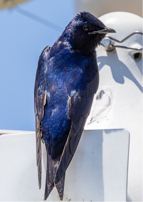 Last year, I became a Purple Martin Landlord. I don’t have a particular preference for Purple Martins over any other bird species, but becoming a landlord seemed like a way to connect with birds more intimately. Purple Martins are the largest swallow in North America. East of the Rocky Mountains, they nest primarily in manmade structures. Indigenous Americans would hang up hollowed-out gourds to serve as cavity nests. These days, most manmade colonies are racks of 6 to 24 plastic gourds hanging 10-15 feet above the ground on a metal pole.