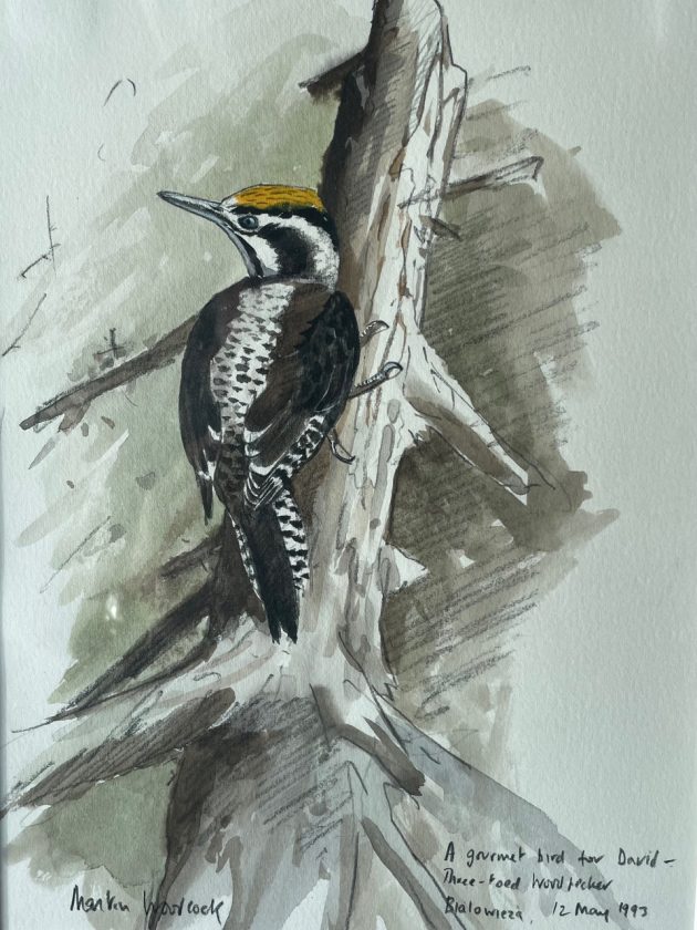 Martin Woodcock’s watercolour sketch of my first Three-toed Woodpecker
