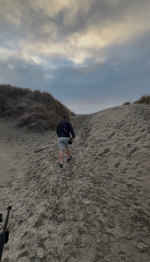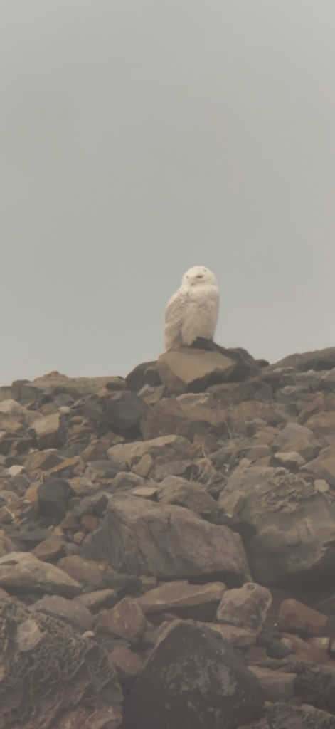 We arrived at the spot with the most recent sighting at 4:00 pm – 30 minutes before sunset – and tried to determine exactly where the bird had been seen using photos posted on Discord. It had first been spotted at the Hatfield Marine Science Center, which is a little further into Yaquina Bay. The owl had moved out towards the Yaquina Bay jetty and was seen moving between the north and south sides. The south jetty has an easily accessible road that leads to a walkway up and over the dunes. There were no obvious birders at the parking lot, so we walked onto the jetty and crossed our fingers. Once we climbed up and down through the dunes, we saw the crowd of birders zoned in on something across the water. Set up the scope, and there it was – our Oregon lifer Snowy Owl!