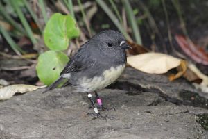 A South Island Robin (Petroica australis) sporting some scientific bling.