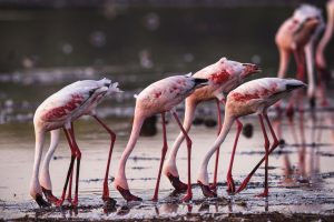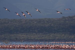 Indeed, one of the pleasures of the book is that the photos were taken from different points of view: from the ground, like this one, of flamingos feeding at Lake Borgoria National Reserve, also in the Rift Valley (the curved beak being positioned upside down in the water, with the nostrils above the surface):