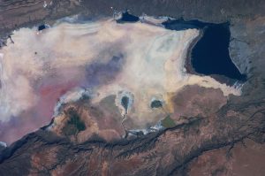 The strangeness of that image is a result of seasonal evaporation exceeding the water inflow, thus allowing salt to concentrate and organisms that thrive in it to prosper. But the other distinctive feature of the photo is that it was taken from outer space, as many photos in the book were (thus, the title).