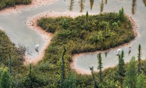That photo, like many of the others in Part Two of the book, was taken at the Wood Buffalo National Park, now the main breeding and nesting habitat for the world’s remaining Whooping Cranes. It’s a great wetland (larger in area than Switzerland) of weird beauty, as shown by Dr. Bondar’s photos, but so far up in Canada that the book includes few photos of the Park from outer space — the International Space Station and NASA flight paths don’t cover those far northern latitudes.