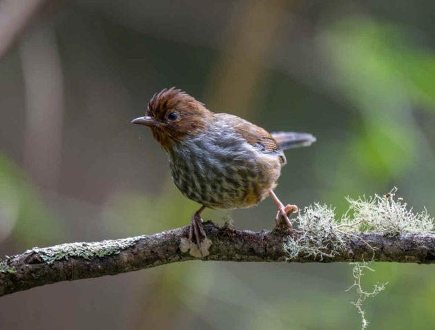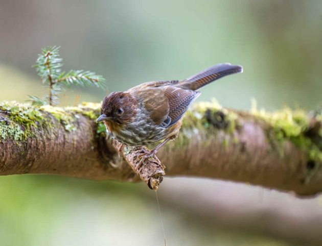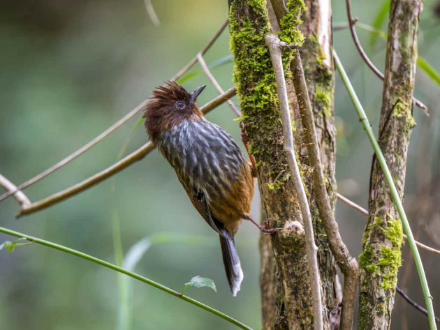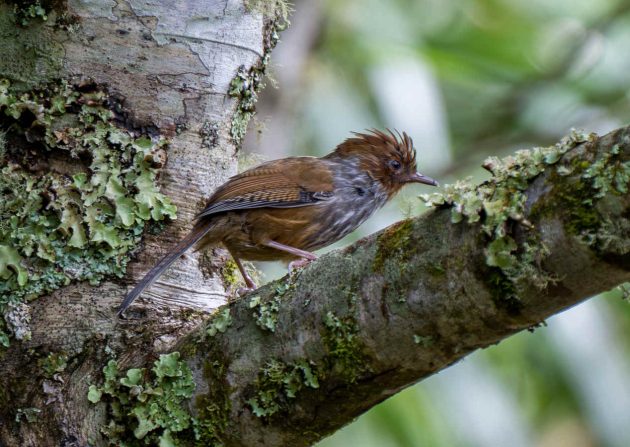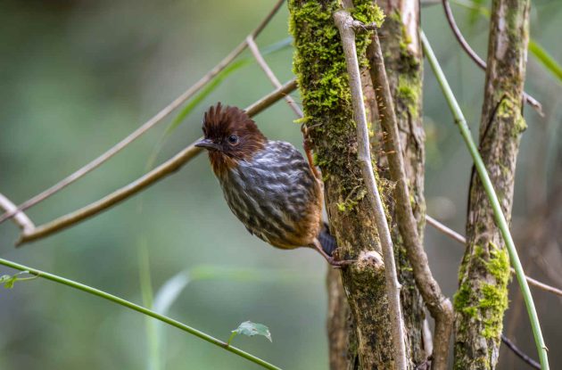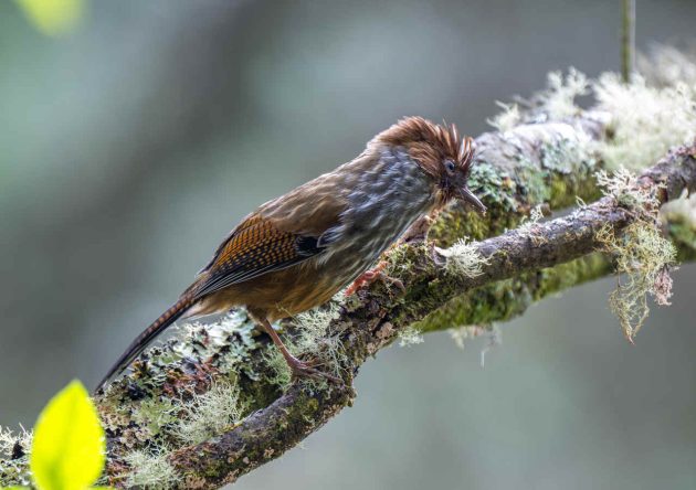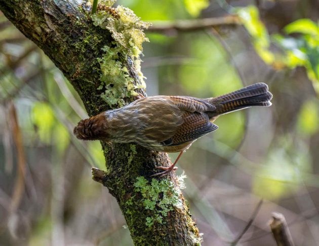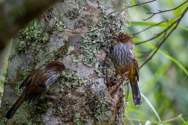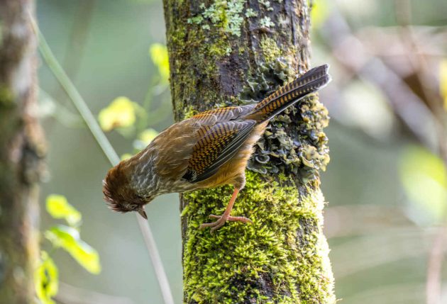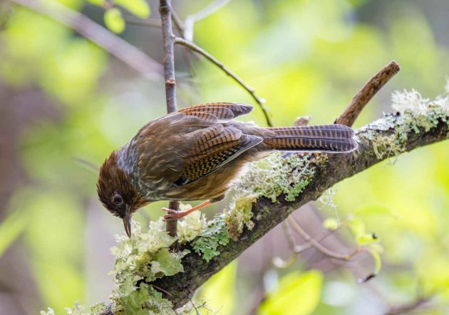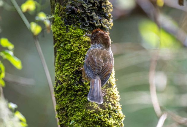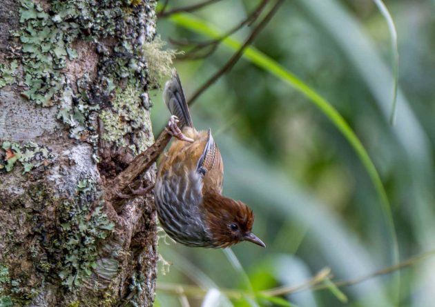 “Mostly arthropods such as beetle larvae (Coleoptera), other insects and their larvae … Creeps among epiphytic growths and along branches, rummages among dead leaves, probes moss and pulls apart lichen in search of food, craning around branches and clinging to their undersides. Beetle larvae obtained by probing bark of trunks and branches.”
