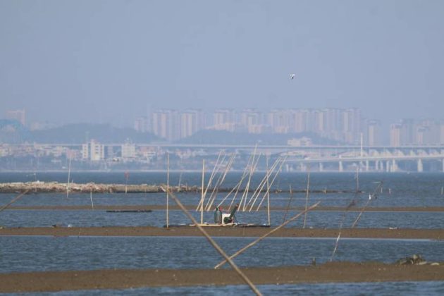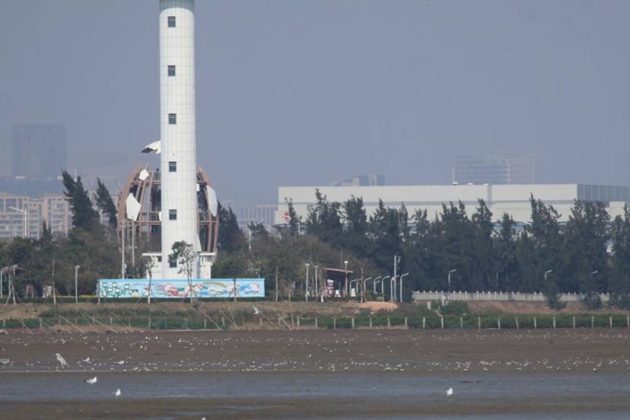 Bird at Quanzhou Bay, with an egg-shaped bird monitoring tower built by the local government