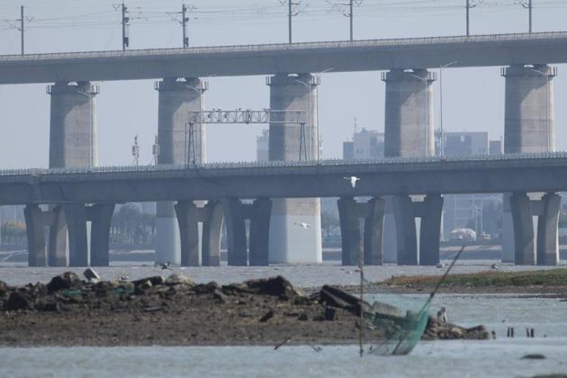 Bewick’s Swans at Quanzhou Bay. Behind the bridges crossing the bay is the wetland park