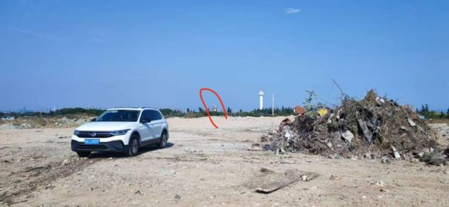 Rubbish high tide roost (taken when birds were not roosting here). The red circle shows the bird monitoring tower on the other side of a national highway