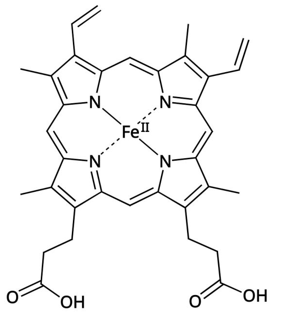 The 4 heme units in the hemoglobin molecule account for about 3.8% of the hemoglobin mass and 3.2% of its number of atoms (of which there are about 9300 in total). For the four iron atoms that do the bulk of the actual work, the share is again much smaller – 0.4% of the total mass and only 0.04% of the share of atoms (iron is comparatively heavy compared to the other elements in the hemoglobin molecule).