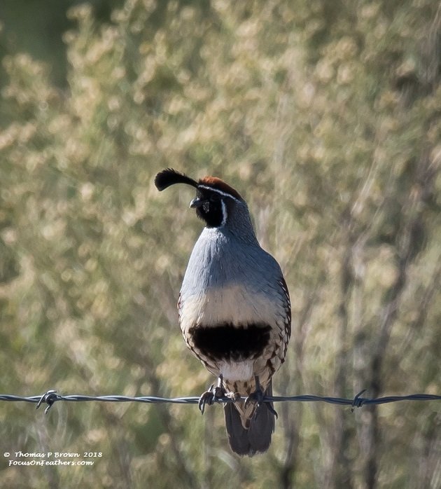 As I got into my truck to leave the area, this Gamble’s Quail jumped up on the barbwire next to the parking lot, as if to say “where ya going, you didn’t take my picture yet” so I did!