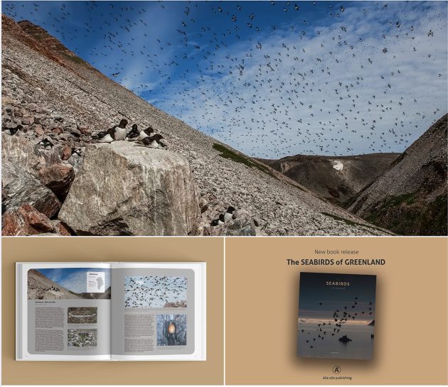 ©2025, The Seabirds of Greenland, Alle Alle Publishing, pp. 92-93; photograph of the Little Auks of Qoororsuaq (Little Auks Valley) by Carsten Egevang, the original photograph and how it is used in the book; the other photos are by Egevang and Kasper Lambert Johansen (from Carsten Egevang’s Facebook site)
