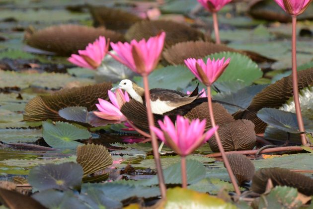 One of the fun birds to observe in Thalangama are the Pheasant-tailed Jacanas. Having previously only known African Jacanas from South Africa, these beasts with their elaborate and aptly-named tail feathers impressed me significantly. They tend to be pretty approachable, affording me good views as they stepped from one waterlily pad to the next. The smaller pads were sometimes pushed partly underwater, producing small pearls of water that gradually accumulated on their hydrophobic surface, glittering in the morning sun.