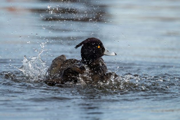 The ubiquitous Mallards aside, Tufted Ducks are probably the most common waterbirds in Munich. The bright orange eye, their namesake tuft, and the clean pied plumage of the males always turn these birds into somewhat of a showstopper nonetheless. I just before having spotted the geese, I spent a few minutes trying to photograph a male taking a bath. Funny that they spend all day in the water and then wash themselves with the same stuff. Dullness factor: zero.