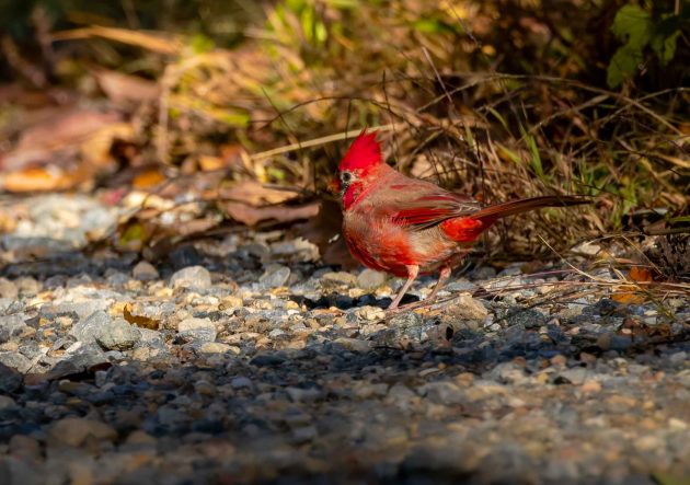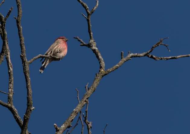 A House Finch was perched high on a bare branch, soaking up the morning sun. Its rosy-red head and chest stood out nicely against the clear blue sky. It didn’t move much, just sat there looking perfectly content. These birds may be common, but when the light hits them right, they’re anything but ordinary.