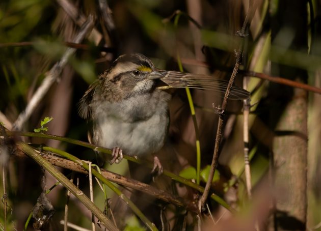 A Song Sparrow was hopping around, restless and alert, pausing just long enough for a quick pose before moving again. Nearby, a White-throated Sparrow sat quietly in the shade, fluffing its chest and carefully preening each feather. They couldn’t have been more different, one full of energy, the other completely calm.