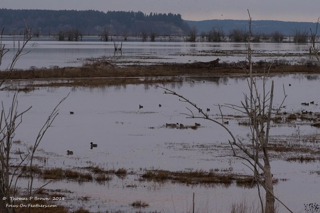 The end of this rather long road trip finds us here in Puyallup, Washington which is just south of Seattle. It seems like the farther the north we go, the colder, and wetter, and a whole lot snowier it gets! We pulled into the RV park next to the Washington State Fairgrounds on Saturday afternoon, and it promptly started snowing! Given the number of countries we will be visiting in the next few months, there are still quite a few logistics that need to be attended to before we can just jump on an airplane, so snow covered roads will not be helpful. Despite all this red tape stuff, I am still making some time for birding. This location is great as it is close to Jeanne’s Family, as well as a very short drive to the Billy Frank Jr. Nisqually NWR. This refuge came up as #4 on a recent list of the top 25 National Wildlife Refuges that were featured in a great story here by 10000 Birds own Jason Crotty. While most major estuaries in Washington state have been filled, dredged, or developed, Nisqually River’s has been set aside for wildlife. In 1974, Nisqually National Wildlife Refuge was established to protect the delta and its diversity of fish and wildlife habitats. The Nisqually estuary was restored in 2009 by removing dikes and reconnecting 762 acres with the tides of Puget Sound. A beautiful series of raised boardwalks have been constructed, allowing year round access to the area, thru the marsh area, all the way out nearly a half mile into the tidal flats. Over 200 species of birds can be found on the refuge, depending on the time of year. Here are a few scenics from my last few days on the refuge.