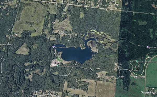 After the adventure in Wyoming I had returned to Minneapolis, saved a Common Yellowthroat at the airport and joined the company conference. The program for the week consisted of meetings, meetings and meetings, but also an activity: hiking Willow River State Park. American conference rooms resemble coffins: cold, stale air and windowless, so even if there had been no birds the excursion could’ve counted on a warm reception indeed. About a dozen of my esteemed colleagues felt the same and this cheerful group left for the park. The park is about 30 to 40 minutes by car from the Minneapolis city centre. The area features woods, lakes, a river, and a waterfall as can be seen in the Google Earth® screenshot below.